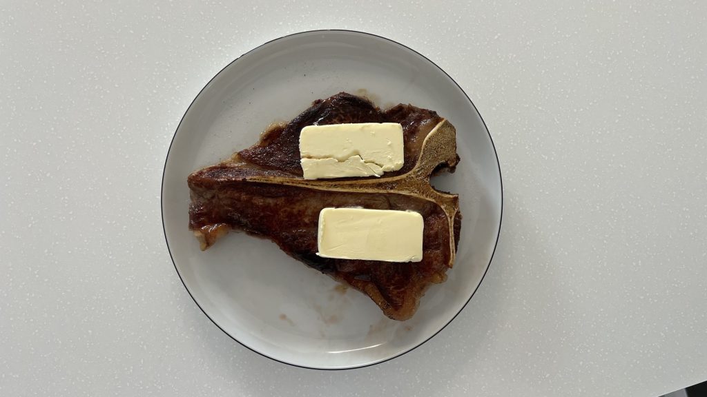 2x týdně si dopřeju pořádnou flákotu. Ve středu a v sobotu si peču T-bone steak. Ne že bych ho nezvládl denně, ale leze to dost do peněz a než abych se cpal levným mletým masem, po kterém je mi zle, dám si radši 2x týdně pořádnou kvalitu.
